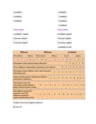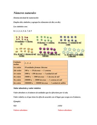 El documento describe el sistema decimal de numeración, incluyendo los símbolos 0-9, la forma en que se agrupan los números, y los conceptos de valor absoluto y valor relativo. También resume las operaciones básicas con números naturales como la adición, sustracción, multiplicación y división, así como propiedades como el uso de paréntesis.