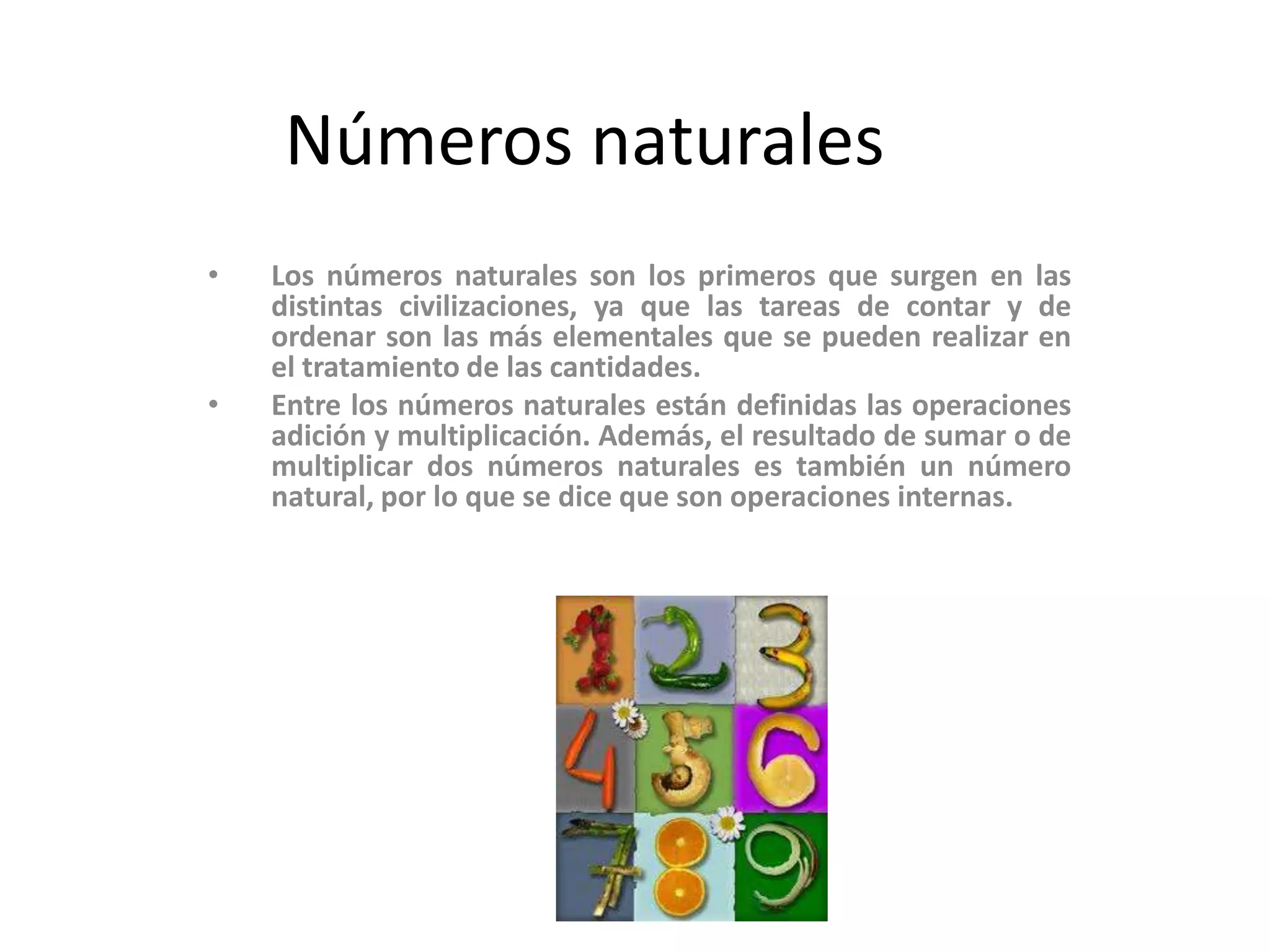 Los números naturales son los primeros números que surgieron en las civilizaciones antiguas y se utilizan para contar y ordenar cantidades. Entre los números naturales se definen las operaciones de suma y multiplicación, cuyos resultados también son números naturales. Las propiedades de los números naturales incluyen la asociatividad, conmutatividad y el cero como elemento neutro de la suma.