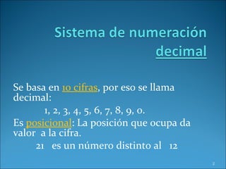 El documento explica los conceptos básicos de los números naturales: su uso para contar y ordenar, su base decimal, la posición de las cifras y su valor, el sistema de órdenes y equivalencias, y la lectura y escritura de números grandes separando por órdenes de unidades. También incluye ejemplos numéricos y la forma de leer números ordinales.