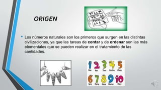 Los números naturales surgieron para contar y ordenar cantidades. Incluyen los números 0, 1, 2, 3, etc. Pueden representarse en una línea numérica y se pueden operar mediante la suma, resta, multiplicación y división. También incluyen conceptos como los números primos, compuestos, múltiplos, divisores, y la resolución de ecuaciones en este conjunto.