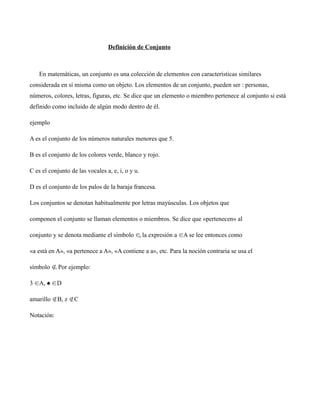 El documento define conjuntos, operaciones con conjuntos como unión, intersección y diferencia, y describe los números reales. Define números racionales como aquellos con expansión decimal periódica e irracionales como aquellos con expansión no periódica. Explica desigualdades, valor absoluto y el plano numérico.