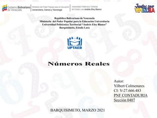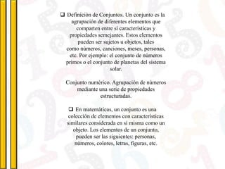 Este documento define conjuntos y números reales, y describe las operaciones básicas de álgebra de conjuntos como unión, intersección, diferencia y complemento. También explica desigualdades matemáticas, incluyendo signos de desigualdad, valor absoluto y cómo resolver desigualdades de valor absoluto considerando casos positivos y negativos.
