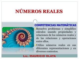 Este documento presenta información sobre números reales. Explica cómo resolver problemas utilizando propiedades de números reales y sus relaciones y operaciones. También cubre temas como representaciones de números reales, términos, valor absoluto, tablas de multiplicar, leyes de signos para suma y multiplicación, y fracciones.