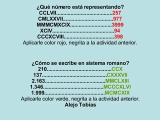 El documento presenta una serie de actividades para practicar la conversión entre números romanos y arábigos. En la primera parte, se piden traducir números romanos a su equivalente arábigo y viceversa en la segunda parte. El documento incluye las respuestas de varios estudiantes a las actividades propuestas.