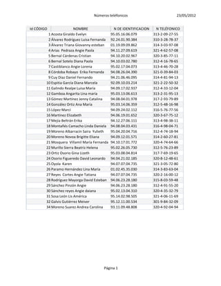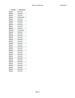 El documento lista 34 personas con sus números de identificación, números telefónicos, ciudad y si el contacto es personal o profesional. La información está organizada en una tabla con columnas para el código, nombre, número de identificación y número telefónico de cada persona.