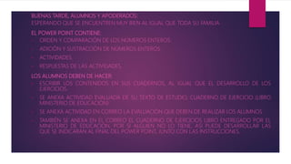 Este documento presenta una lección sobre números enteros para estudiantes de séptimo grado. Explica cómo representar y ordenar números enteros en una recta numérica, y cómo realizar operaciones de suma y resta con números enteros, incluyendo ejemplos. También incluye actividades para que los estudiantes completen como evaluación.