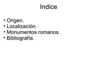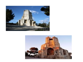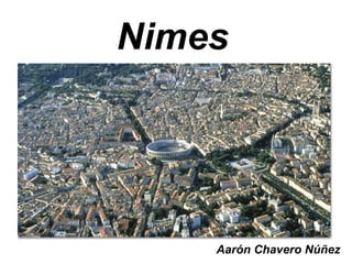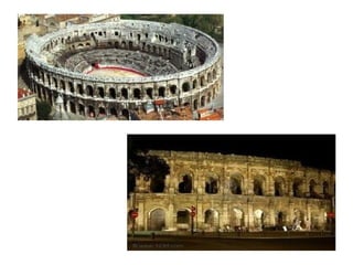 Este documento describe la historia y los monumentos romanos de la ciudad de Nimes en el sur de Francia. Fue fundada originalmente por los galos y luego los romanos establecieron una colonia llamada Colonia Augusta Nemausus en el siglo I a.C. Construyeron una muralla, teatro, anfiteatro y otros edificios públicos. El anfiteatro de Nimes, completado en el siglo I d.C., es el mejor conservado del mundo. Otros monumentos notables son la Casa Cuadrada, el Templo de Diana, la Torre Magna y