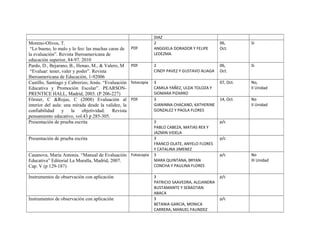 El documento detalla una lista de lecturas y recursos sobre evaluación educativa, incluyendo libros y artículos de diversos autores, con fechas de consideración y tipos de formato. Incluye títulos significativos como 'La evaluación en una concepción de aprendizaje significativo' y 'Manual de evaluación educativa'. Además, se mencionan capítulos, páginas y los nombres de los estudiantes responsables de cada lectura.