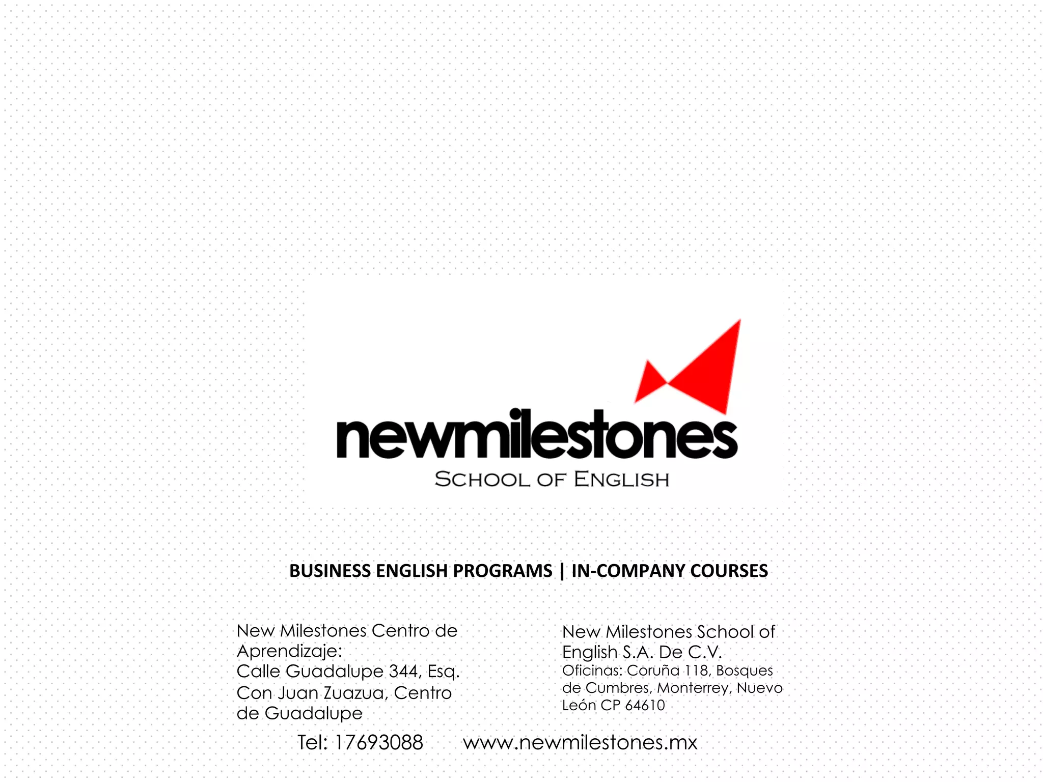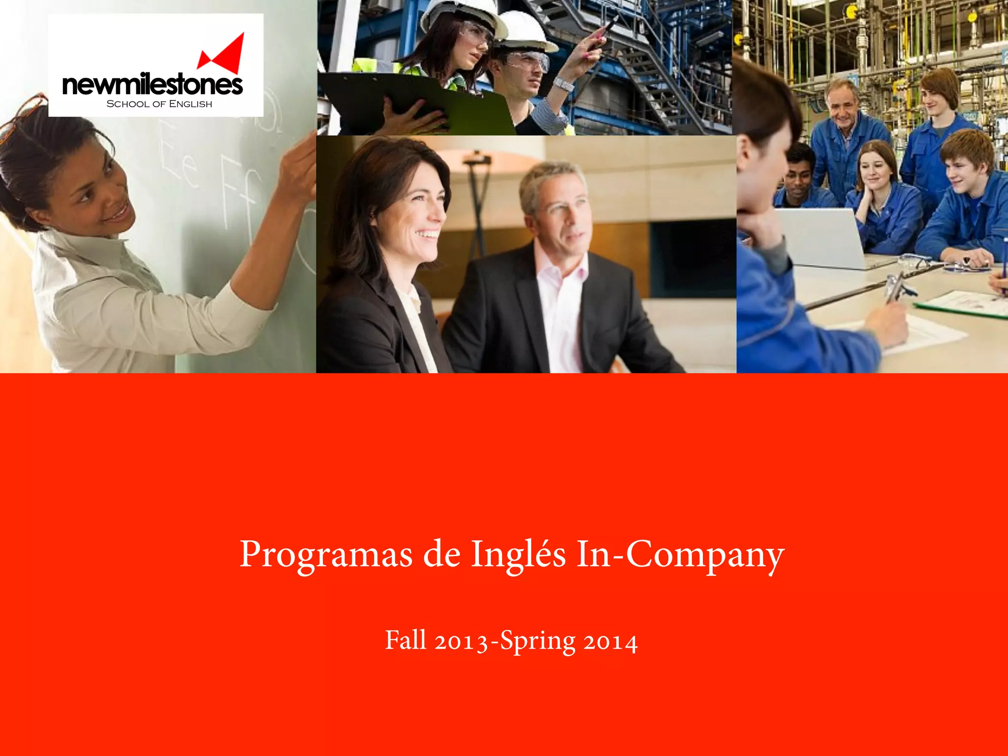Este documento describe los programas de inglés in-company ofrecidos por New Milestones para empresas entre otoño de 2013 y primavera de 2014. Los programas se enfocan en habilidades de conversación y escucha activa, e incluyen módulos en diferentes niveles de inglés. Los cursos se imparten en las propias empresas para maximizar la eficiencia y control de la empresa sobre el programa.