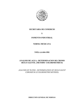 Este documento establece el método colorimétrico para determinar cromo hexavalente en agua. El método involucra la reacción del cromo hexavalente con difenilcarbazida para producir un complejo de color violeta que puede cuantificarse espectrofotométricamente. Se describe el procedimiento para preparar una curva de calibración y analizar muestras de agua, incluyendo posibles interferencias. La norma fue aprobada en enero de 1982.
