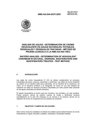 Este documento establece el método para determinar cromo hexavalente en aguas naturales, potables, residuales y tratadas mediante espectrofotometría. El método involucra una reacción entre el cromo hexavalente y la 1,5-difenilcarbazida que produce un color violeta cuya intensidad es proporcional a la concentración de cromo hexavalente. Se definen términos como muestra, patrones y control de calidad, y se especifican equipos, reactivos, procedimientos de re