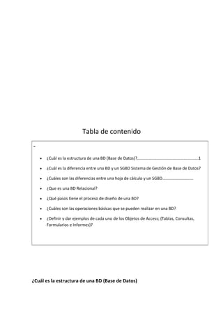 Este documento describe los conceptos básicos de las bases de datos, incluyendo la estructura de una base de datos, la diferencia entre una base de datos y un sistema de gestión de base de datos, las operaciones básicas que se pueden realizar en una base de datos como selección, proyección, unión y producto cartesiano, y los objetos principales de Access como tablas, consultas, formularios e informes. También explica el proceso de diseño de una base de datos y proporciona ejemplos de cada uno de los objetos de Access.