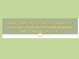 Este documento describe cómo la comunicación es fundamental en la educación. Explica que la comunicación permite establecer un puente entre personas para compartir sentimientos y pensamientos. Además, destaca que las nuevas tecnologías permiten la comunicación en el mismo tiempo y lugar, como también en el mismo tiempo pero lugares distintos, o en tiempos distintos pero el mismo lugar. El documento concluye resaltando la importancia de una comunicación efectiva y real.