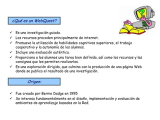 Este documento describe una WebQuest, que es una investigación guiada utilizando recursos de Internet que promueve habilidades cognitivas superiores y trabajo cooperativo. Explica las características, estructura y tipos de WebQuest, así como herramientas gratuitas para crearlas como PHP WebQuest y Instant WebQuest.
