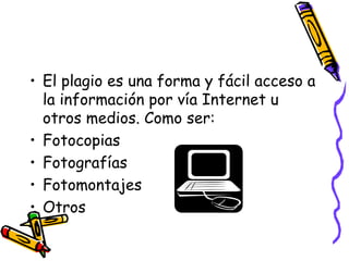 Este documento discute los problemas del plagio y estrategias para prevenirlo. Explica que el plagio incluye copiar trabajos de otros estudiantes o textos sin citar fuentes. Sugiera enseñar valores como el respeto y estrategias de resumen a niños para contrarrestar el plagio. También recomienda incentivar el trabajo original y creativo.