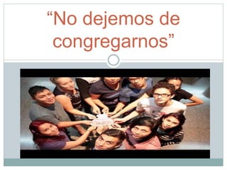 El documento habla sobre la importancia de congregarnos como creyentes, citando Hebreos 10:24-25. Exhorta a no abandonar las reuniones como algunos tienen por costumbre, sino a estimularnos mutuamente al amor y las buenas obras. Advierte que se acerca el día del Señor y debemos mantenernos firmes en la fe.