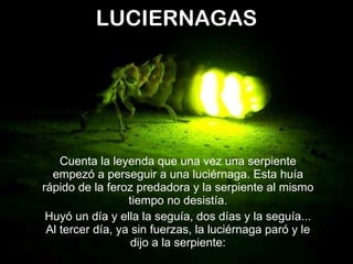 La historia cuenta de una luciérnaga que es perseguida por una serpiente durante tres días. Agotada, la luciérnaga le pregunta a la serpiente por qué la persigue si no es su presa ni le ha hecho daño. La serpiente responde que la persigue porque no soporta verla brillar. La moraleja es que a veces otros tratarán de apagar nuestro brillo por envidia o inseguridad, pero debemos continuar siendo nosotros mismos.