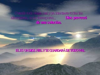 Este documento ofrece consejos y palabras de aliento para momentos difíciles. Aconseja no desistir y confiar en que Dios proveerá una solución, ya que Él es fiel y protegerá del mal. También sugiere buscar a Dios diariamente, tener sueños y objetivos, y recordar que días mejores vendrán.