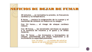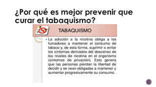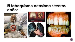 El documento habla sobre los efectos negativos del tabaquismo. Señala que el tabaquismo es una enfermedad crónica causada por la nicotina, una droga adictiva. Aunque algunas personas fuman por moda, las campañas en contra del tabaco han reducido esta tendencia. El tabaquismo también está relacionado con abortos espontáneos, nacimientos prematuros y malformaciones fetales. El humo del cigarrillo afecta al feto incluso antes del nacimiento.