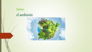 Este documento trata sobre el medio ambiente y ofrece varias recomendaciones para cuidarlo. Explica que el ambiente es todo lo que rodea a los seres vivos y define diferentes tipos como el ambiente natural, social y de trabajo. Luego describe formas en que los humanos contaminan el medio ambiente a través de la tala, contaminación del agua y aire, entre otros. Finalmente da consejos para cuidar el medio ambiente en casa y recomienda evitar bolsas plásticas, cultivar un huerto y aprovechar la luz natural.