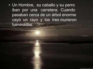 Un hombre, su caballo y su perro mueren tras ser alcanzados por un rayo. Siguen su camino y llegan a un lugar que les dicen que es el cielo, pero solo dejan entrar al hombre. Más adelante llegan a otro lugar donde les dejan beber a los tres, y les dicen que ese sí es el verdadero cielo.