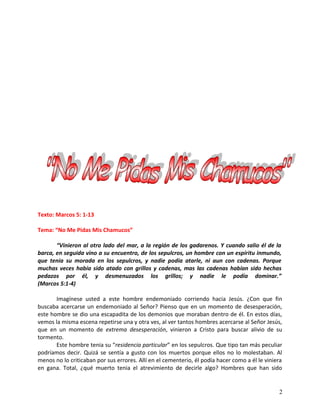 El documento aborda el pasaje de Marcos 5:1-13 sobre el endemoniado gadareno, resaltando la desesperación y el sufrimiento emocional que enfrenta el hombre poseído. Se reflexiona sobre cómo muchos buscan a Jesús en sus momentos de tormento, pero a menudo quieren aferrarse a aspectos negativos de sus vidas, representados como 'chamucos' o 'puercos'. Finalmente, enfatiza la importancia de liberarse de relaciones y pensamientos que alejan a las personas de Dios y su paz.