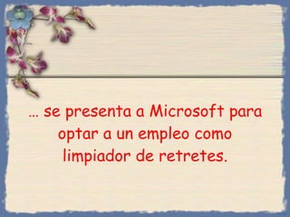 Un hombre desempleado se presenta a un trabajo de limpieza en Microsoft pero es rechazado por no tener correo electrónico. Decide vender frutas puerta a puerta y, tras tener éxito, amplía su negocio hasta convertirse en dueño de una gran empresa alimenticia en 5 años. Años más tarde, al buscar un plan de pensiones, descubre que todavía no tiene correo electrónico, lo que le lleva a bromear que de haberlo tenido antes habría seguido limpiando retretes.