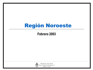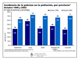 El documento presenta estadísticas sobre la pobreza, indigencia, empleo, educación y salud en las provincias de Catamarca, Jujuy, Salta, Santiago del Estero y Tucumán entre 1998 y 2002. Muestra que la pobreza y la indigencia disminuyeron en general pero siguen siendo altas, especialmente entre los niños; el desempleo y trabajo precario son problemas importantes; y el acceso a la salud y educación sigue siendo desigual entre las provincias.