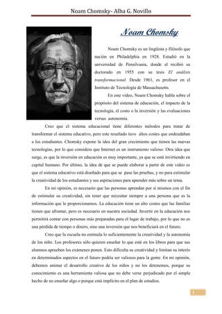 Noam Chomsky habla sobre el propósito del sistema educativo, el impacto de la tecnología y la importancia de la inversión en educación. Chomsky considera que la educación debería estimular la creatividad de los estudiantes más que enfocarse en las pruebas. También cree que Internet es una valiosa herramienta educativa y que invertir en capital humano a través de la educación beneficiará el futuro.