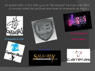 Este documento resume varias opciones para salir de fin de semana en Córdoba según los diferentes estilos musicales. Proporciona lugares para escuchar rock, cuarteto, electro-pop y música punchi. También incluye información adicional sobre un blog con detalles de la movida cordobesa.