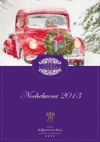 Este documento presenta el menú de Nochebuena 2013 de un hotel, que incluye platos como langostinos al vapor con crujiente de maíz y agridulce de limón, foie mi-cuit sobre pan de frutos secos y compota de manzana, y lubina salvaje de la ría con cremoso de patata ahumada y ajada. El menú cuesta 88 euros por persona e incluye vinos, aguas, refrescos, café y cava. La celebración del menú queda sujeta a confirmación del hotel.