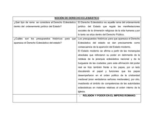 El derecho eclesiástico es una rama del ordenamiento jurídico que regula la dimensión religiosa en la vida humana, emergiendo históricamente con el fortalecimiento del estado moderno frente a la jerarquía eclesiástica. A lo largo de la historia, ha habido un conflicto entre el poder político y la autoridad religiosa, destacando la evolución del cristianismo y la influencia del cesaropapismo. En América Latina, el reconocimiento de la iglesia católica como oficial ha generado tensiones entre el estado y la iglesia, llevando a una falta de estudio sistemático de la disciplina del derecho eclesiástico.