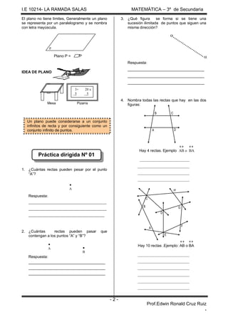 Este documento presenta definiciones básicas de geometría incluyendo puntos, rectas, semirrectas, rayos y planos. Explica cómo se representan y sus características principales. También incluye ejemplos y preguntas de práctica sobre estos conceptos geométricos fundamentales.