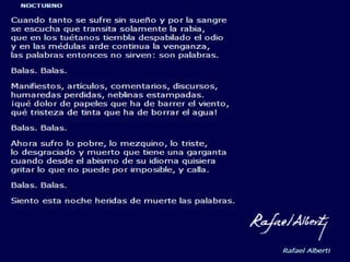 Este poema de Rafael Alberti lamenta que durante la guerra civil española las palabras de políticos, periodistas e intelectuales, incluidas las del propio poeta, han sido sustituidas por las balas debido al odio, la rabia y la venganza que generan los conflictos bélicos, dejando así "heridas de muerte" a las palabras.