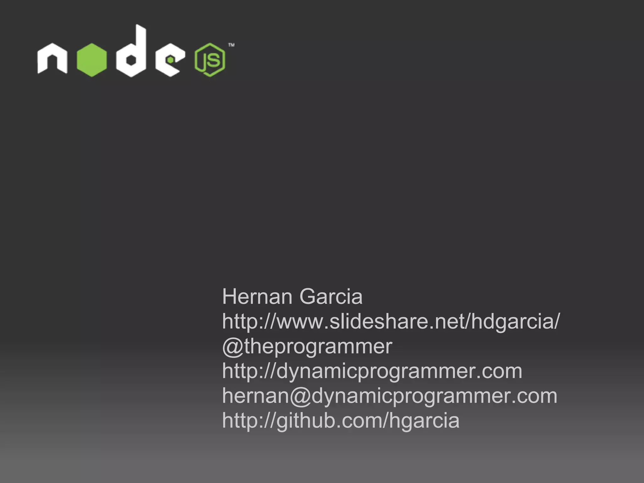 Este documento presenta una introducción a Node.js, incluyendo qué es, cómo instalarlo e implementar módulos, eventos, bases de datos y paquetes npm. Explica conceptos clave como callbacks, CommonJS y el manejo de paquetes con npm.