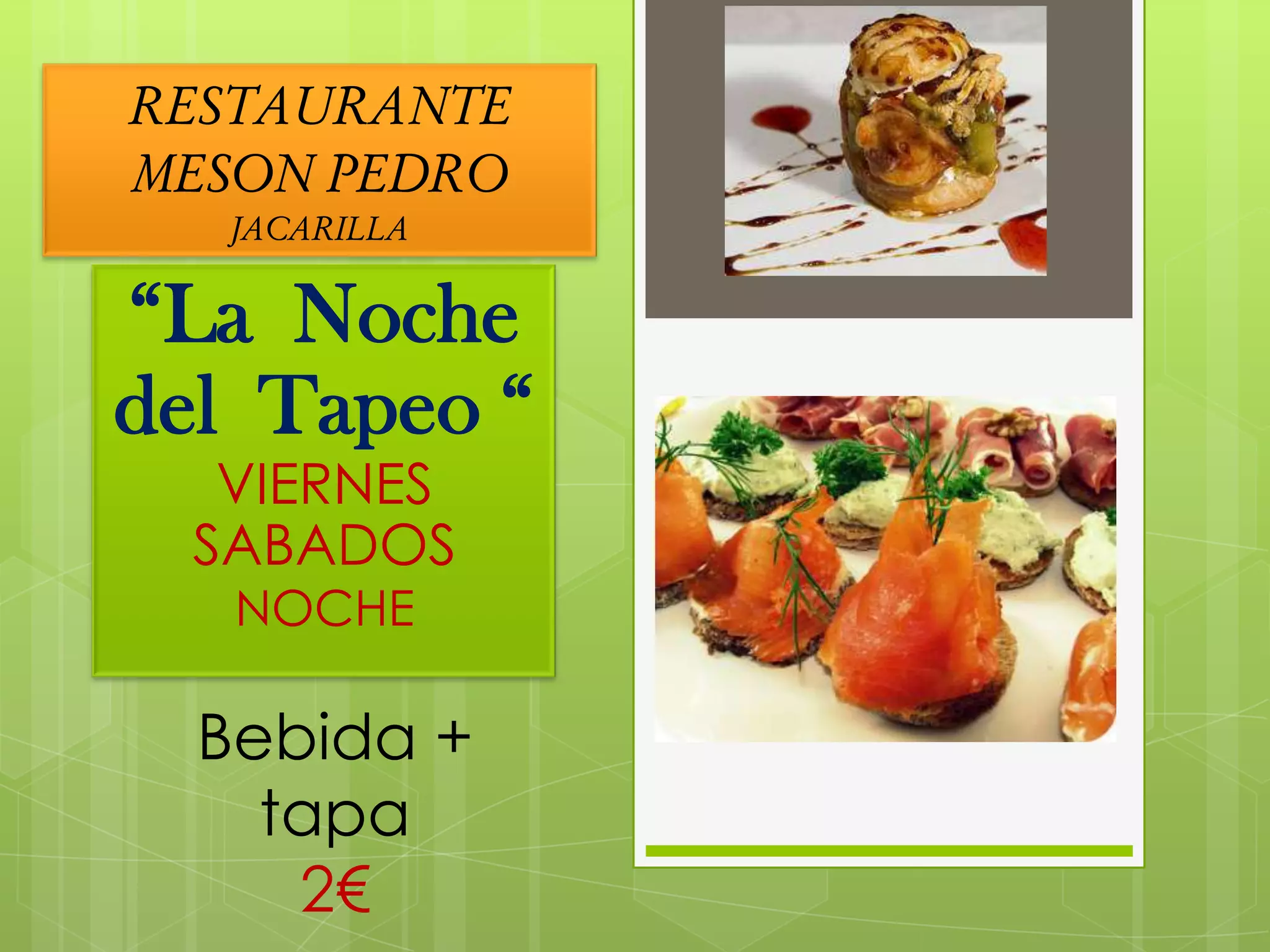El restaurante Mesón Pedro en Jacarilla ofrece las noches de viernes y sábados "La Noche del Tapeo" donde se puede disfrutar de una bebida y una tapa por 2€.