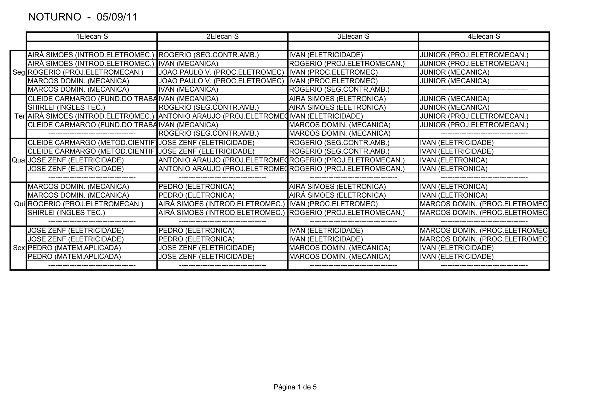 Este documento presenta un horario de turno nocturno del 5 de septiembre de 2011 con la distribución de profesores y alumnos en diferentes cursos y materias. Se dividen en 4 columnas con los diferentes grupos y se enumeran las asignaciones de cada profesor en las diferentes horas.