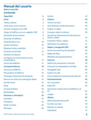 Este manual del usuario proporciona instrucciones sobre cómo comenzar a usar el Nokia Lumia 505, incluyendo cómo encender el teléfono, insertar la tarjeta SIM, cargar la batería, conocer las teclas y funciones básicas, copiar contactos de otro teléfono, y obtener ayuda y soporte. También cubre temas como personalizar la configuración, tomar fotos, navegar en Internet, y usar aplicaciones como correo electrónico, calendario y mapas.