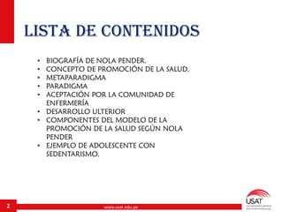 Este documento presenta el Modelo de Promoción de la Salud de Nola Pender. El modelo se enfoca en ayudar a las personas a adoptar un estilo de vida saludable para mantener su bienestar en lugar de tratar enfermedades. Describe los componentes del modelo, incluyendo factores personales, cognitivos y afectivos que influyen en los comportamientos de salud, así como ejemplos de su aplicación. El modelo busca empoderar a las personas para que tengan mayor control sobre su propia salud a través de la educación y la promoción de