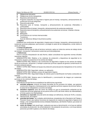 La Norma Oficial Mexicana NOM-005-STPS-1998 establece las condiciones de seguridad e higiene para el manejo, transporte y almacenamiento de sustancias químicas peligrosas en los centros de trabajo. La norma incluye definiciones relevantes, obligaciones del patrón como realizar un estudio de riesgos y mantener actualizados los procedimientos de manejo seguro, y requisitos generales y específicos para diferentes tipos de sustancias químicas. El objetivo es prevenir daños a la salud de