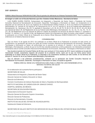 La norma oficial mexicana NOM-019-SSA3-2013 establece las características y especificaciones mínimas para la práctica de enfermería en el sistema nacional de salud en México. Su objetivo es garantizar que los servicios de enfermería se brinden conforme a las disposiciones legales y se completen adecuadamente en todos los niveles de atención. Esta norma es obligatoria para todos los establecimientos de salud y profesionales que ofrezcan servicios de enfermería de manera independiente.