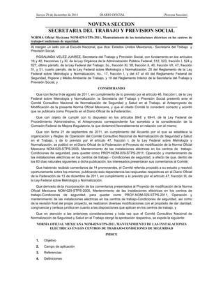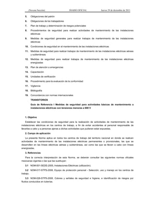 Este documento presenta la Norma Oficial Mexicana NOM-029-STPS-2011 sobre el mantenimiento de instalaciones eléctricas en centros de trabajo. Establece las obligaciones del patrón y los trabajadores para realizar dichas tareas de manera segura. Incluye definiciones clave, procedimientos de seguridad, equipo de protección personal requerido y medidas para trabajos en líneas energizadas o espacios confinados. El objetivo es prevenir accidentes eléctricos durante el mantenimiento de instalaciones.