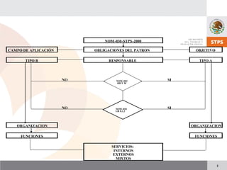 1) La norma establece los lineamientos para desarrollar y promover los Servicios Preventivos de Seguridad y Salud en el Trabajo, y las acciones necesarias para promover un ambiente laboral seguro y sano que prevenga accidentes y enfermedades. 2) Define los servicios preventivos de seguridad y salud en el trabajo como los prestados por personal capacitado para funciones de prevención, protección, control y asesoría en seguridad y salud. 3) Establece criterios para clasificar los centros de trabajo como Tipo A y
