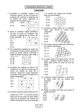 El documento presenta tres casos relacionados con el estudio de parentescos y relaciones familiares. Luego, incluye una serie de ejercicios de lógica y razonamiento sobre diferentes temas como parentescos, cubos mágicos, figuras geométricas y situaciones hipotéticas.