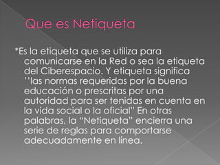 La "Netiqueta" se refiere a las normas de comportamiento adecuado en línea. Estas reglas incluyen tratar a los demás con respeto, seguir los mismos estándares de comportamiento que se utilizan en la vida real, y ser consciente de las normas en cada sitio web o dominio. Las netiquetas también requieren respetar el tiempo y ancho de banda de los demás, y sirven para promover una comunicación más agradable y productiva en Internet.