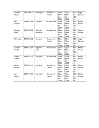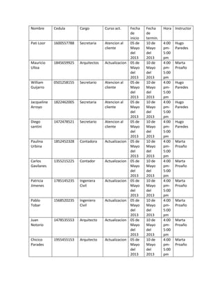 El documento lista los nombres, cargos, cursos de capacitación, fechas de inicio y término, horarios e instructores de varios empleados. La mayoría de los empleados son secretarios, contadores, ingenieros y arquitectos que tomaron cursos de atención al cliente o actualización del 5 al 10 de mayo del 2013 de 4:00 pm a 5:00 pm con Hugo Paredes o Marta Proaño como instructores.