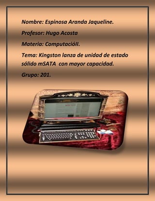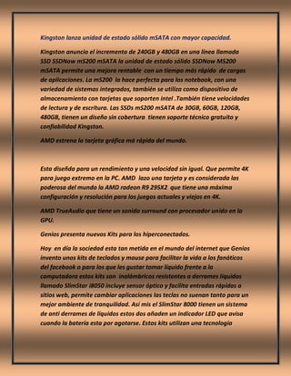 El documento habla sobre tres temas principales: 1) Kingston lanza unidades de estado sólido mSATA con mayor capacidad, 2) AMD estrena la tarjeta gráfica más rápida del mundo, y 3) Genios presenta nuevos kits para los hiperconectados como teclados inalámbricos resistentes a derrames.