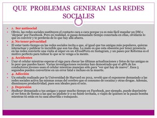 Este documento resume los principales puntos sobre las redes sociales. Identifica algunos problemas que generan como ser antisocial, falta de privacidad, adicción y depresión. Explica las ventajas e inconvenientes de su uso y ofrece pautas para un uso adecuado, prevención de peligros y las 10 redes sociales más populares.