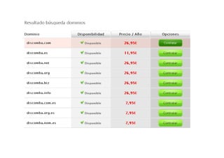 Un nombre de dominio traduce una dirección web amigable (como www.miempresa.com) a una dirección IP numérica, permitiendo encontrar sitios web sin conocer la dirección IP. Los nombres de dominio identifican empresas y personas en Internet y se han convertido en parte de su identidad. El sistema DNS traduce nombres de dominio a direcciones IP gracias a servidores raíz gestionados por ICANN. Para registrar un dominio se elige un registrador acreditado y se verifica su disponibilidad.