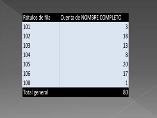 Este documento contiene varias tablas con datos estadísticos. La primera tabla muestra el recuento de estudiantes por código de identificación. La segunda tabla divide el recuento total de 80 estudiantes por asignatura. La tercera tabla cruza los códigos de identificación de los estudiantes con sus asignaturas matriculadas. La cuarta tabla muestra el recuento de estudiantes por grado cursado. La quinta tabla presenta el promedio de nota por código de identificación.